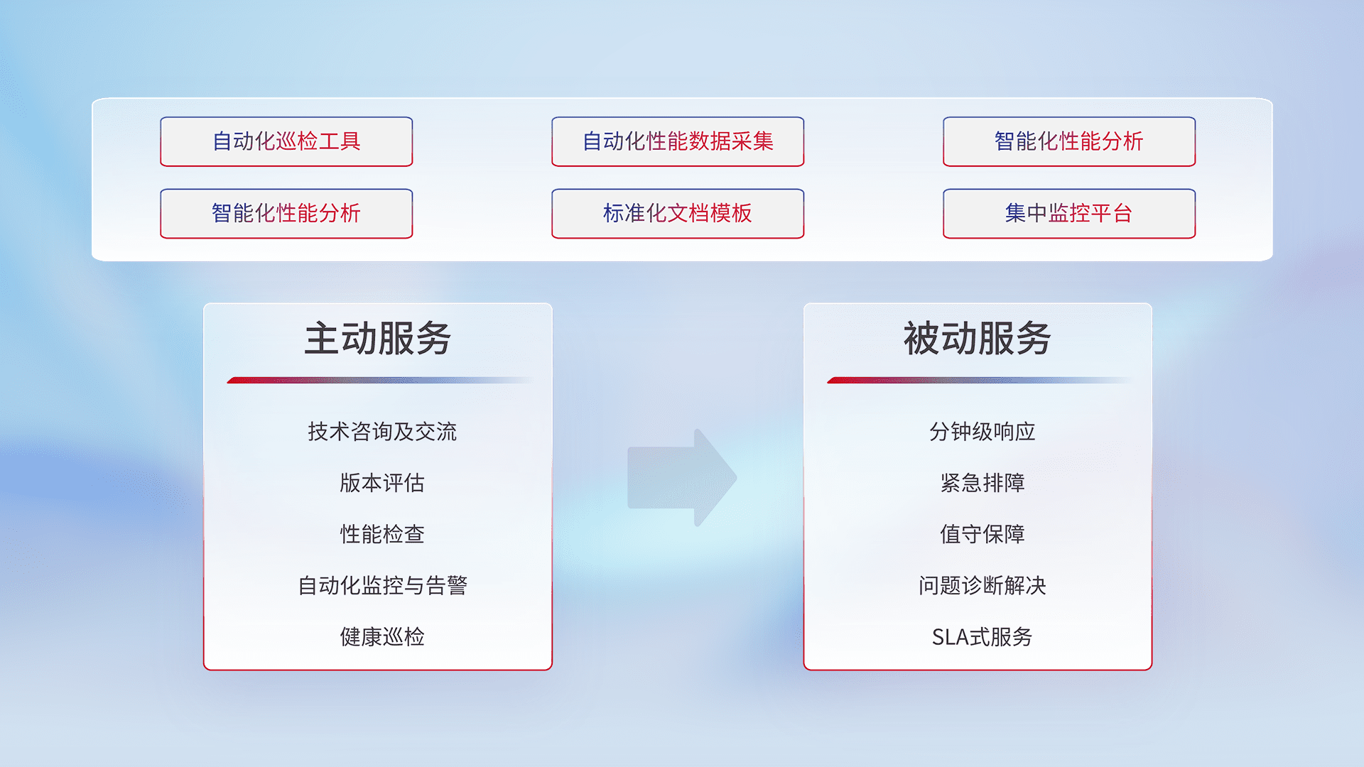 智能化工具和标准化文档,,,保障服务质量,,,提供主动服务(包含技术咨询、、版本评估、、、、性能检查、、、、自动化监控与告警、、健康巡检)和被动服务包含(分钟级响应、、、紧急排障、、值守保障、、、问题诊断解决、、SLA服务)。。。。